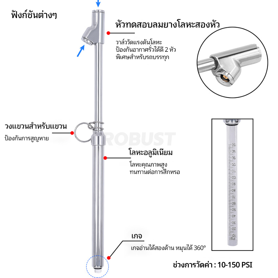 – วัดแรงดันได้ระหว่าง 10-150 psi สำหรับรถยนต์ ระบรรทุก จักรยาน และมอเตอร์ไซค์ และอื่นๆ
